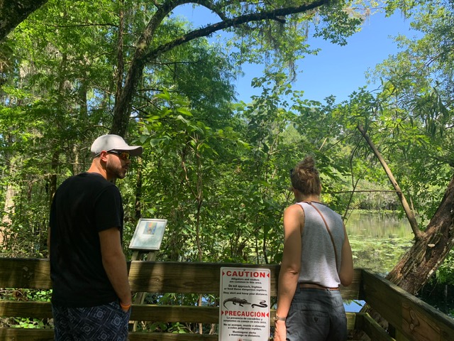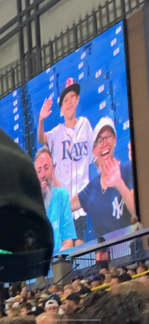 [June 20] The next day, the three of us went to Lettuce Lake Conservation Park in the morning. It has a 3,500 ft. boardwalk and observation tower over a section of the Hillsborough River, home to many alligators and turtles that we saw! It was such a cool experience getting to walk along the boardwalk and be surrounded by nature. After, we took a short field trip to a Bass Pro Shop in Brandon. THEN, we drove over to Tropicana Field to catch batting practice before the Yankee vs. Rays game started. Bobby even almost caught a practice Home Run ball, but it hit the tip of his glove and bounced backwards. We learned that the Rays have the lowest ballpark attendance, but the highest viewership on television. They also used to have the worst rated concessions, but recently everything had been redone. During the game I made it onto the jumbotron!